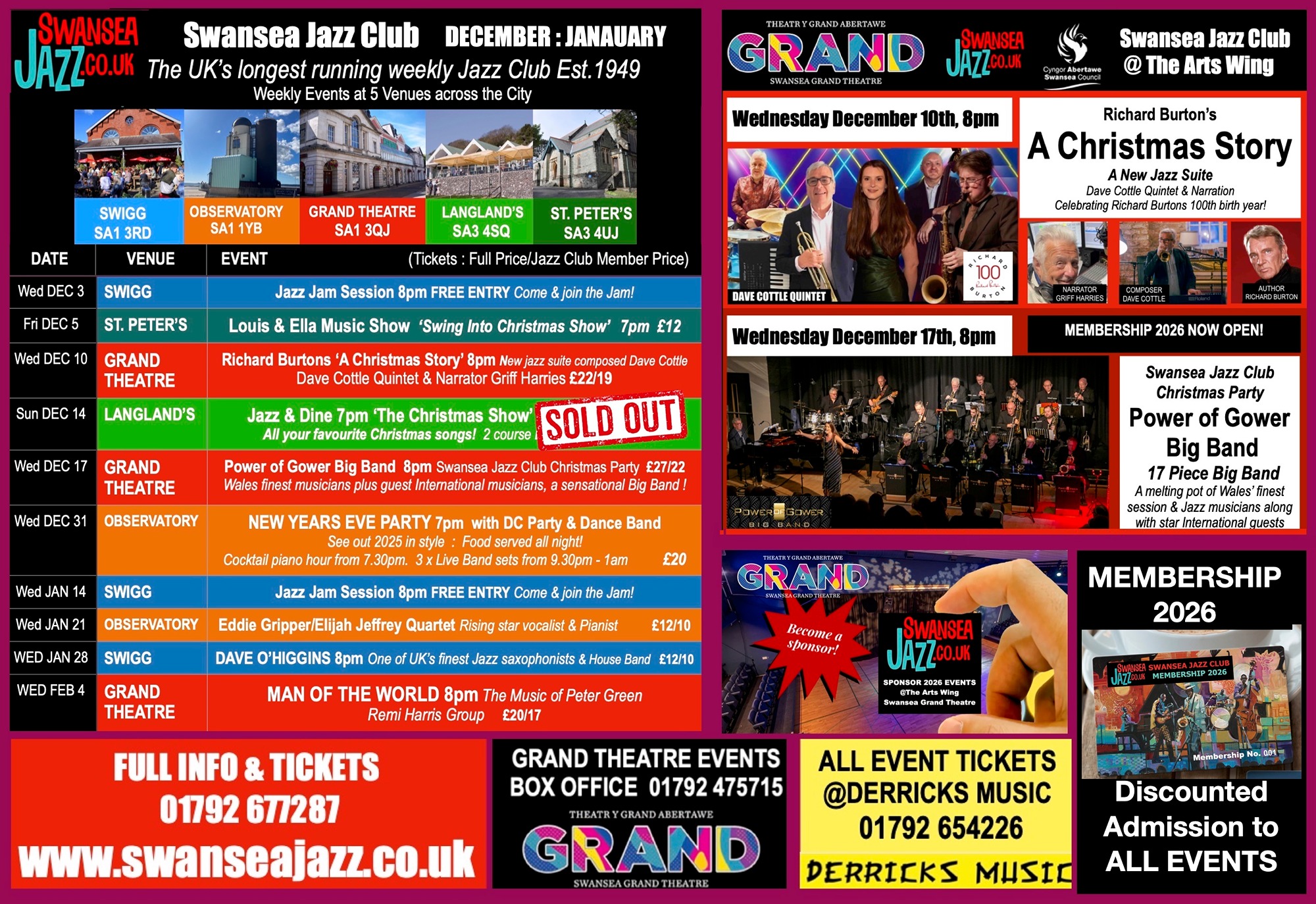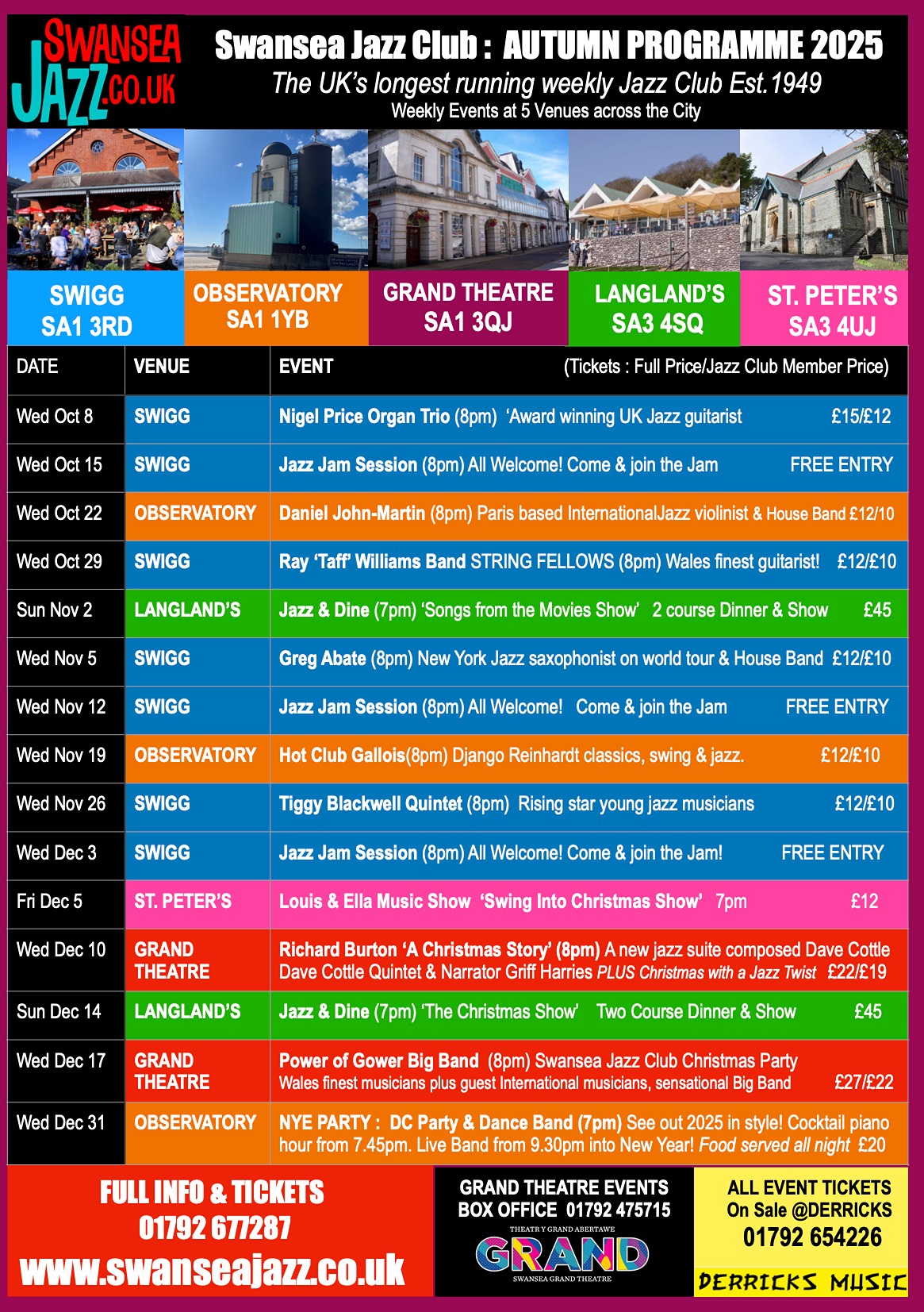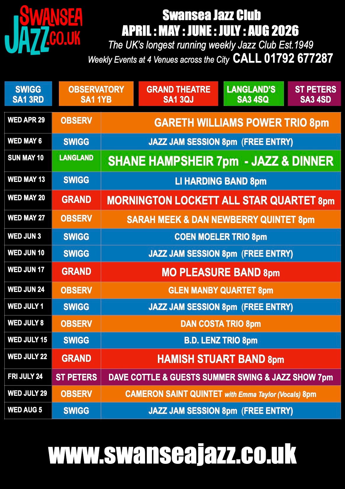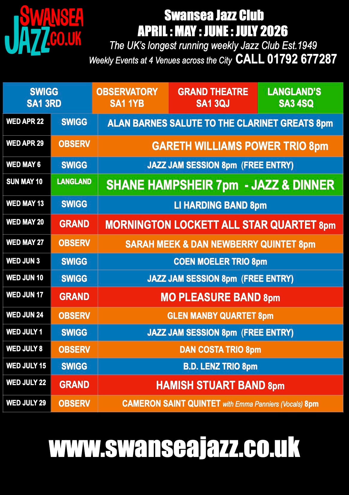 Swansea Jazz Club Events are taking place at 5 Venues around Swansea