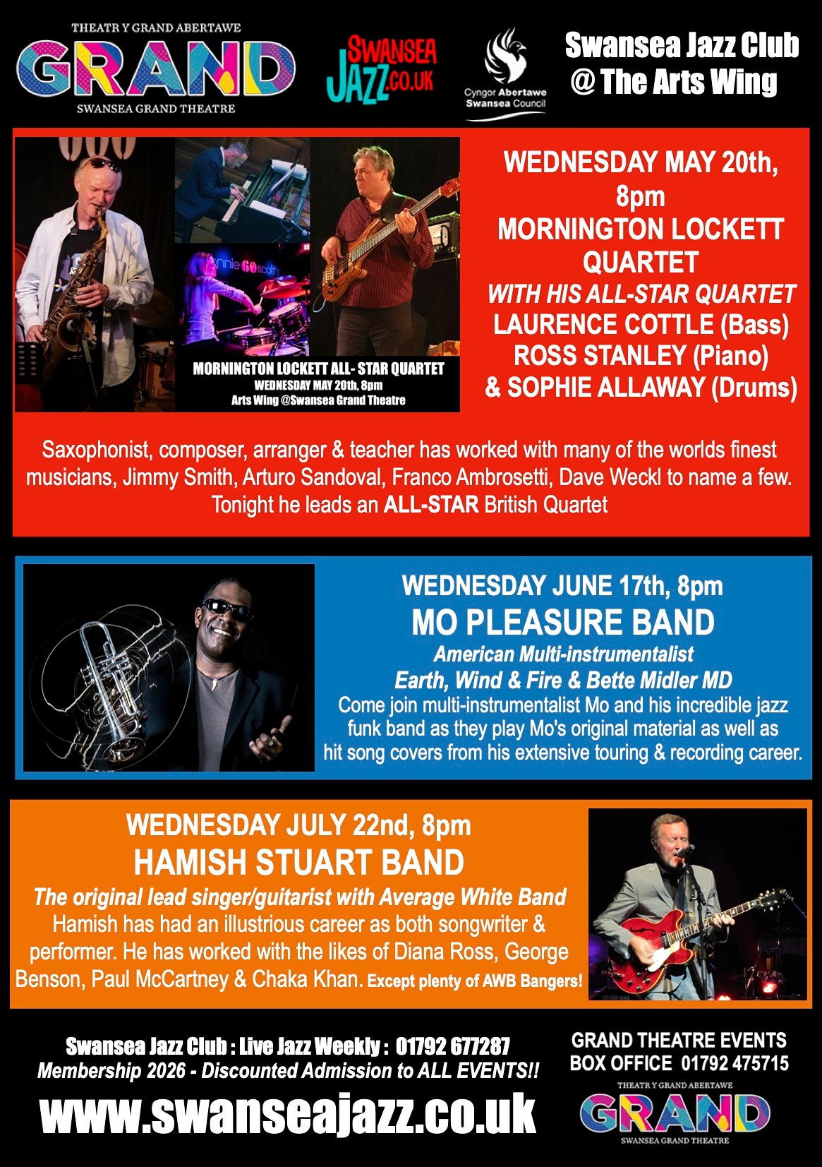 BOOK OVER THE PHONE /ENQUIRIES : CALL 01792 677287. Events at the Arts Wing GRAND THEATRE BOX OFFICE 01792 475715 All tickets available from DERRICKS MUSIC 01792 654226